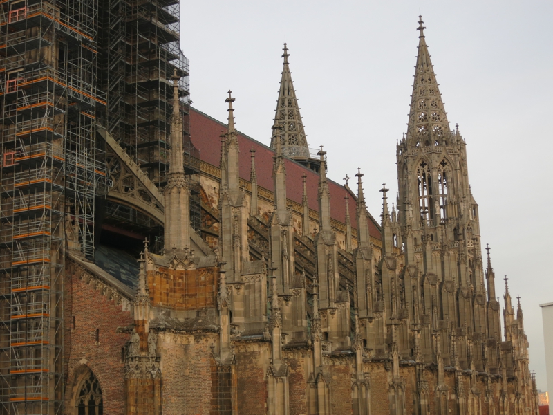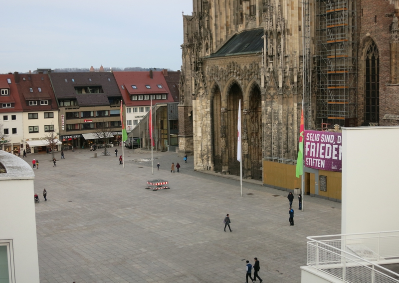Der imposant große Platz vor dem Ulmer Münster ist flächig mit ROSA DANTE-Granitplatten mit Herkunft aus Spanien belegt. Der rosane Farbeindruck wird