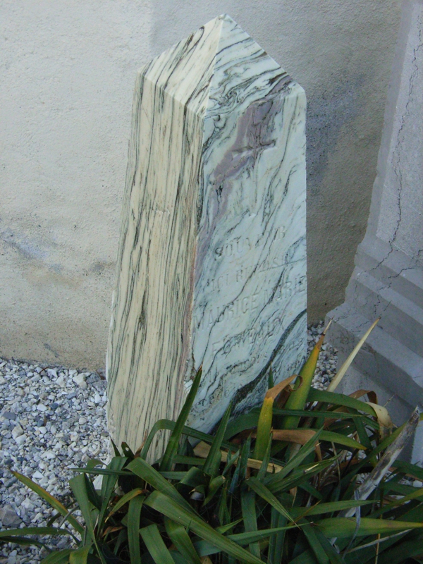 Das kleine Grabmal für Maurice Marie Fumeaux an der östlichen Kirchwand ist ein nach oben konisch verlaufender Obelisk mit spitzwinkliger Abdachung. Durch seine Geometrie sind die grünen und violetten Bänderungen sowohl "mit dem Lager" als auch "gegen das Lager" sehr gut erkennbar.