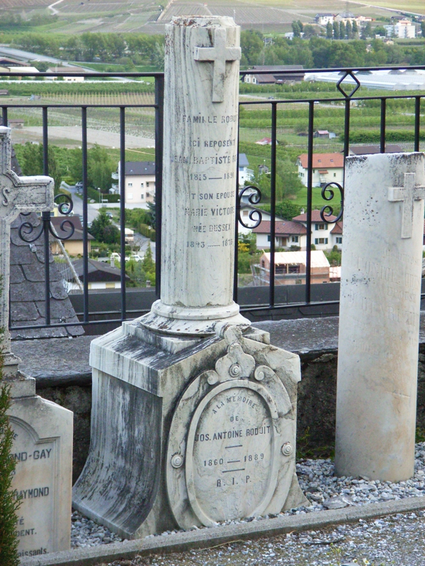 Das Familiengrab von Jean Baptist Roduit (1815-1891), Marie Victoire Roduit (1823-1873) und Jos. Antoine Roduit (1860-1889) besteht aus einem Sockel und einem Säulenstumpf, der wegen seines flach gearbeiteten Kopfes vermutlich früher einen Aufsatz, beispielsweise eine Schmuckurne trug. Das verbliebene Grabmal wurde in zwei Stücken aus dem Cipollinomarmor von Saillon gefertigt. Die beiden Werkstücke bestehen aus einer zurückhaltend grün gestreiften Partie des häufig elfenbeinweißen Marmors, die "mit dem Lager" gebrochen wurde. Der Säulenkörper trägt die Namen und Lebensdaten des Ehepaars Roduit. Aus dem nach unten ausschwingenden Sockel wurde eine Kartusche mit zurückhaltender Verzierung für einen weiteren Namenszug plastisch ausgearbeitet.