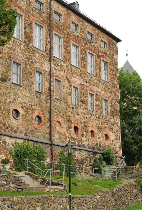 Die Mauern des alten Schlossbereichs sind ein Beispiel des historischen Hochbaus mit einer Kieselschieferverwendung, wo der Anteil dieser Gesteinssorte nicht hoch, jedoch auffallend ist. Neben Bausteinen in unregelmäßigen Formen aus grünem Tonschiefer, dunkelgrünem Diabas und schwarzen Pikriten sind hier als zugehauene Quaderstücke auch eine helle Buntsandsteinsorte und ein Knotenkalk erkennbar. Die Kieselschieferstücke sind in der Fläche des Bruch- und Feldsteinmauerwerks unregelmäßig verteilt. Durch ihren schwarzen Grundton mit den darin auffallend weißen Quarzaderungen treten sie für das Auge des Betrachters im unverputzten Mauerwerksverband meist gut sichtbar in Erscheinung.