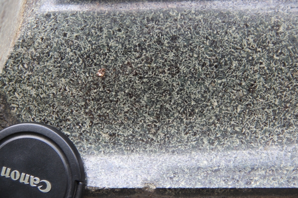 - Beschreibung: feinkörnig, grünschwarz; typisch ist das ophitisches Gefüge der wirr angeordneten Feldspatleisten/-leisten; Grünfärbung durch Chloritisierung.
