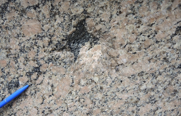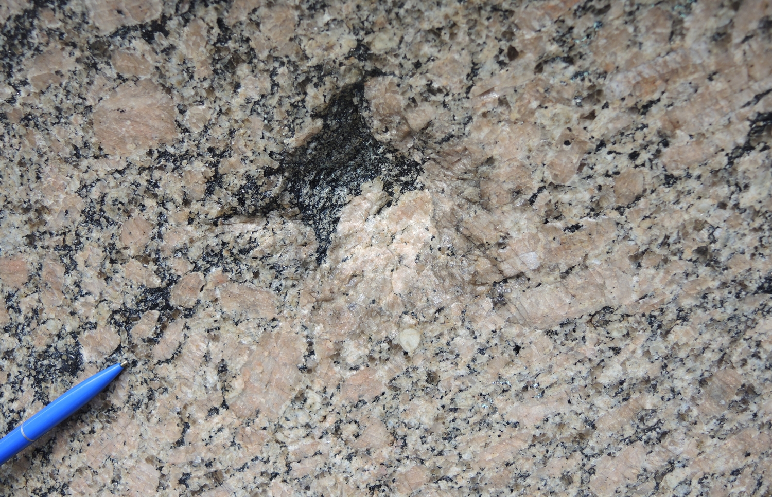 kann man die großen länglichen rosafarbenen Feldspäte gut erkennen, bei denen häufig der eine Teil heller und der andere Teil dunkler erscheint