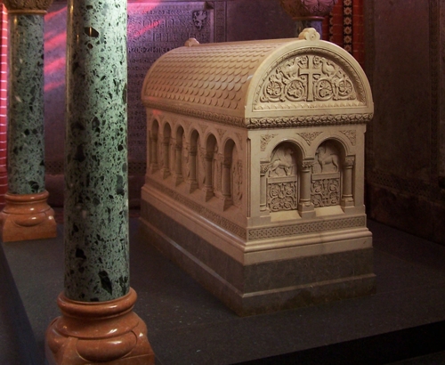 Abb. 3: Der Sarkophag aus Botticino-Kalkstein. Sockel des Sarkophags: Lahnmarmor.