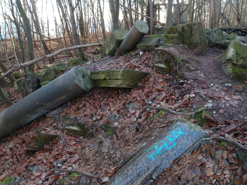 Zu den im Umfeld des ehemaligen Schlosses verteilt liegenden Trümmern, zählen auch Säulen aus Granit des Typs Virbo, teilweise mit Hochglanzpolitur. Unten am Stand befindet sich eine größere Anzahl von Quadern aus Lausitzer Granit, die erst in der Zeit der militärischen Nutzung dorthin gelangt sind.