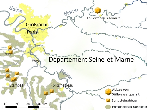 Abb. 5: Verbreitung und Abbaustellen Fontainebleau-Sandstein.