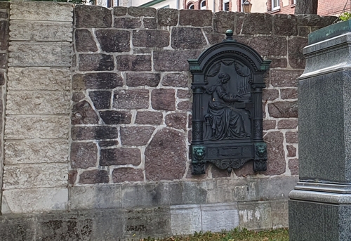 Abb. 5: Bronzerelief der Hl. Cäcilie, der Schutzpatronin der Kirchenmusik, an der Natursteinmauer. Diese besteht aus Quadern einer rötlichen Rotliegend-Brekzie. Die hellen Gesteine des Sockels der Natursteinmauer und der pfeilerartigen Unterbrechungen wurden nicht bestimmt.