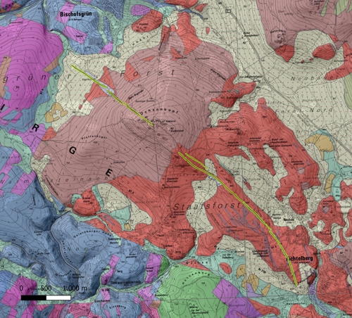 Abb. 6: Geologische Karte des Ochsenkopfgebietes (Fichtelgebirge, Nordost-Bayern) mit Kennzeichnung des Proterobasganges. Grundlage: Digitale Geologische Karte von Bayern 1:25.000. Bayerisches Landesamt für Umwelt, www.lfu.bayern.de, unter der Lizenz CC BY 4.0. Ergänzt durch die Topografie, © Datenquelle: Bayerische Vermessungsverwaltung, GeoBasis-DE / BKG 2023 – Daten verändert; OpenData. Bearbeitet mit QGIS 3.38.