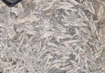 Abb. 2: In ihrer Form an Pinienkerne (ital. Pinoli) erinnernde Magnesitkristalle. Auch der Vergleich mit Schupfnudeln ist möglich. Die leicht elongierten groben Kristalle sind eingebettet in eine dunkle graphitische Matrix.