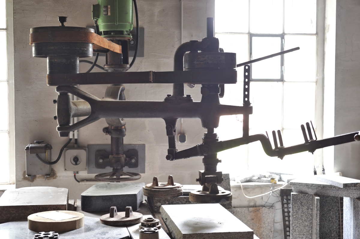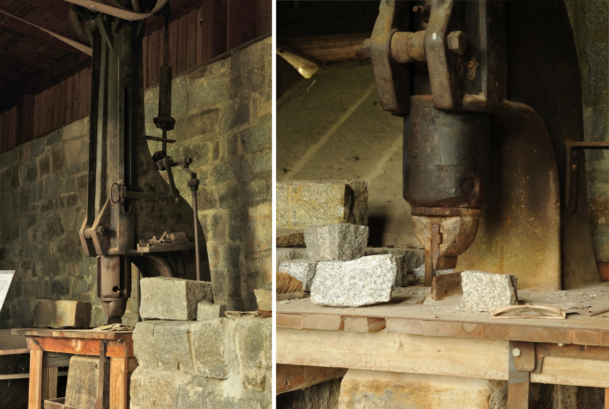 In einer Werksbaracke stehen zwei Fallhämmer und eine hydraulisch betriebene Spaltmaschine, mit denen gespaltene Pflastersteine (Mosaik-, Klein- und Großpflaster) in Handarbeit hergestellt wurden. Solche Maschinen sind hierzulande nur noch selten erhalten geblieben.